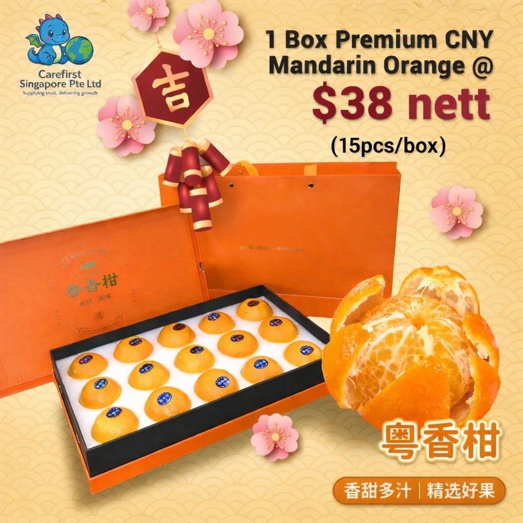 A beautifully curated Premium Mandarin Orange Gift Box (15 pcs), featuring bright, juicy and sweet mandarin oranges. Each fruit is individually selected and labelled, packed in an elegant festive gift box in vibrant orange-red—symbolizing prosperity, abundance and good fortune.